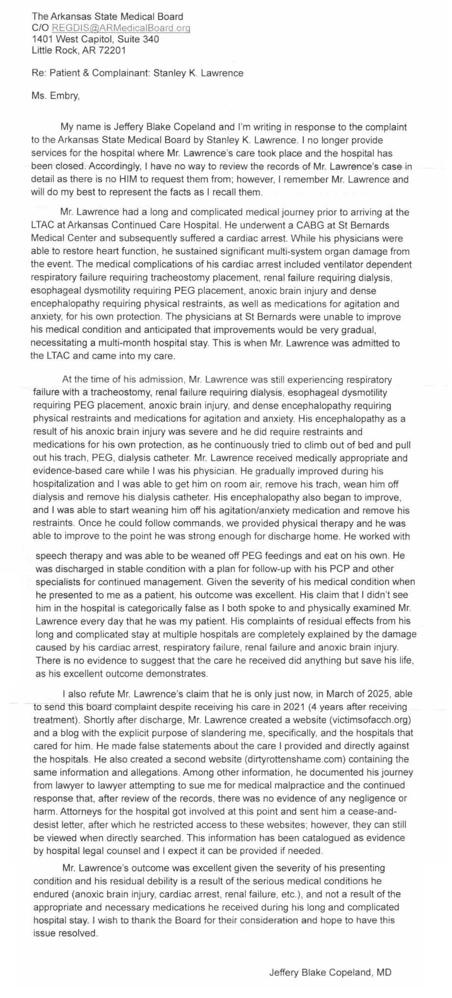 This letter is a formal complaint regarding Jeffery Blake Copeland, a doctor employed from January 2021 through March 2021 and to the best of my knowledge at this time, by Arkansas Continued Care Hospital (ACCH) in Jonesboro, Arkansas.