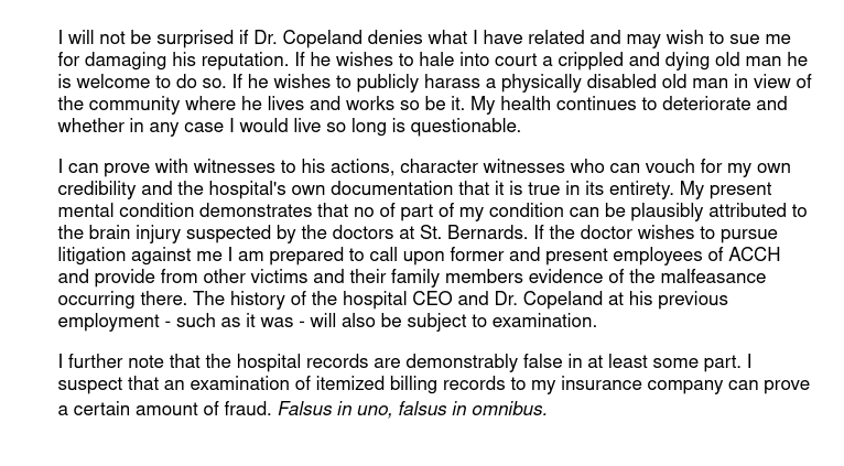 Dr. Copeland's statement that he examined me and spoke to me every day is false. As I stated in my letter I asked day after day to have him see me and he never came. To this day I have never seen him. As I said if he was there while I was either sedated or dissociated then I was unaware of it and anything that I said or did. As for his assertion that he saw me on the days when I requested his presence it is a lie. I was visited daily by family members who told me that he refused to accompany them to my room but stayed in his office and they had to stand outside as he had another person in the office. Furthermore I have been told by a reliable source that he was sometimes absent from the hospital working at another job. And as I said before "Falsus in uno, falsus in omnibus". There is no reason to believe anything he says.