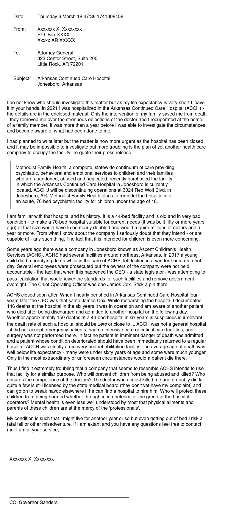 Several months ago I sent you a letter describing the conditions at the recently defunct Arkansas Continued Care Hospital in Jonesboro. I described in considerable detail the treatment