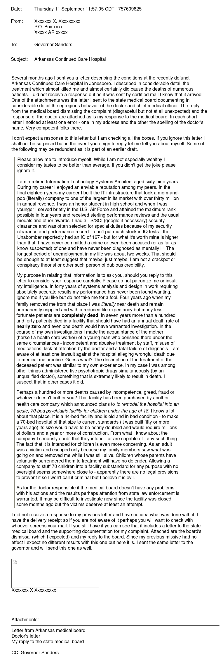 attachments was the letter I sent to the state medical board documenting in considerable detail the egregious behavior of the doctor and chief medical officer. The reply from the medical board