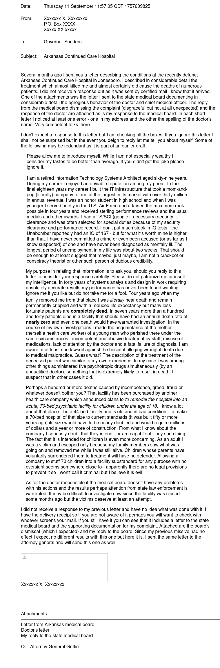 Several months ago I sent you a letter describing the conditions at the recently defunct Arkansas Continued Care Hospital in Jonesboro. I described in considerable