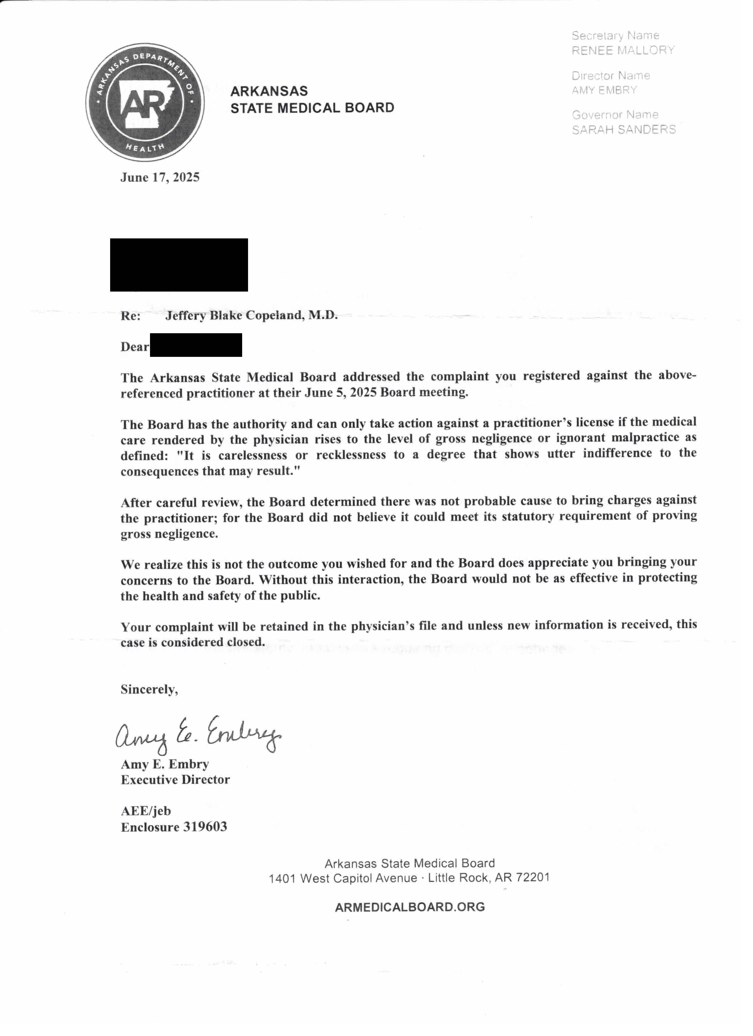 I have your letter dated 17 June (it seems to have arrived less than a week ago that could be the mail service but you addressed it to the wrong post office box) dismissing my complaint against Dr. Copeland. It is exactly what I expected but I'm checking all the boxes. I personally don't give the proverbial fig what you do with it but am sending you a letter refuting Dr. Copeland's denials. Whether or not you forward it to him I again don't care.