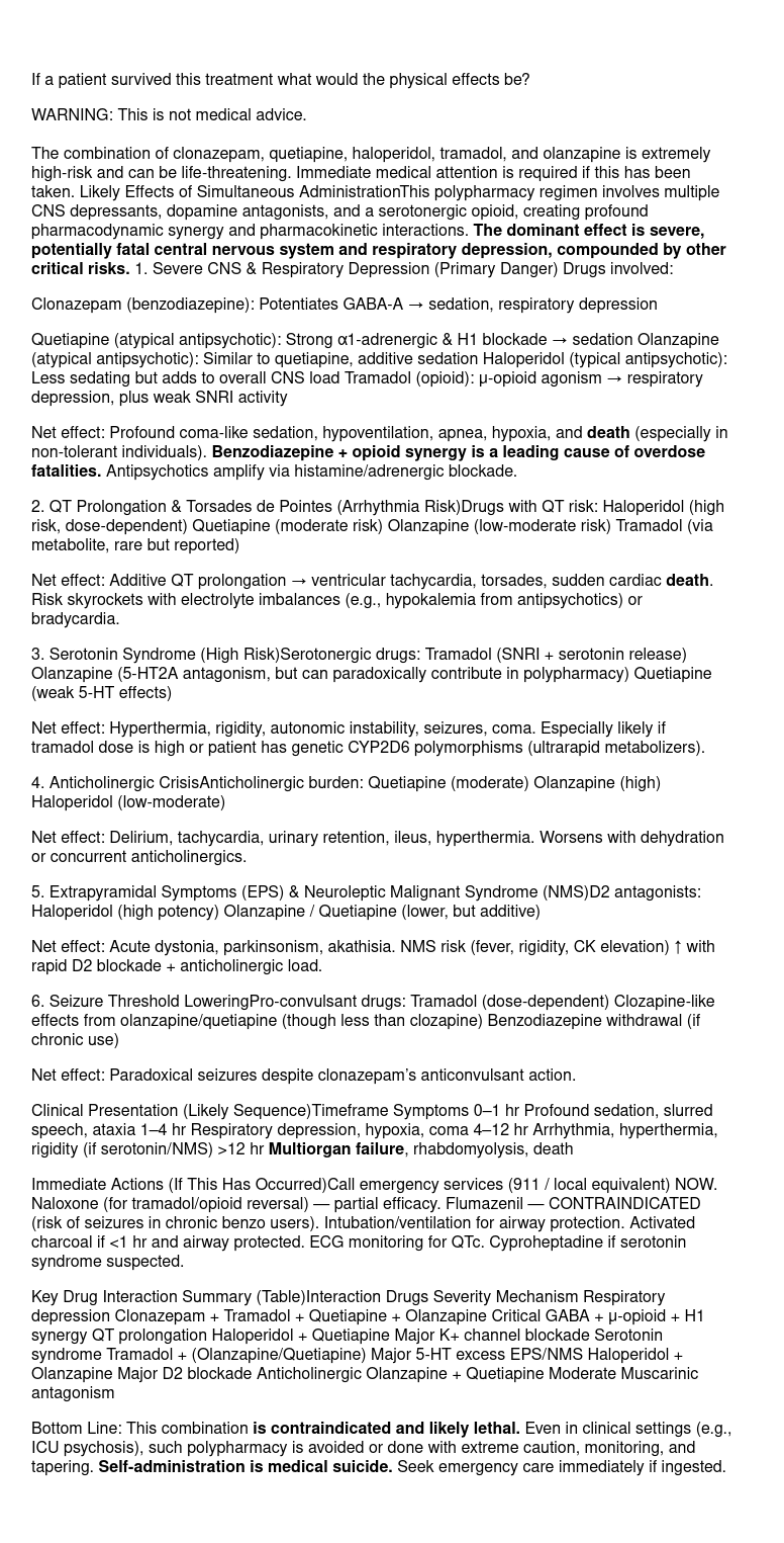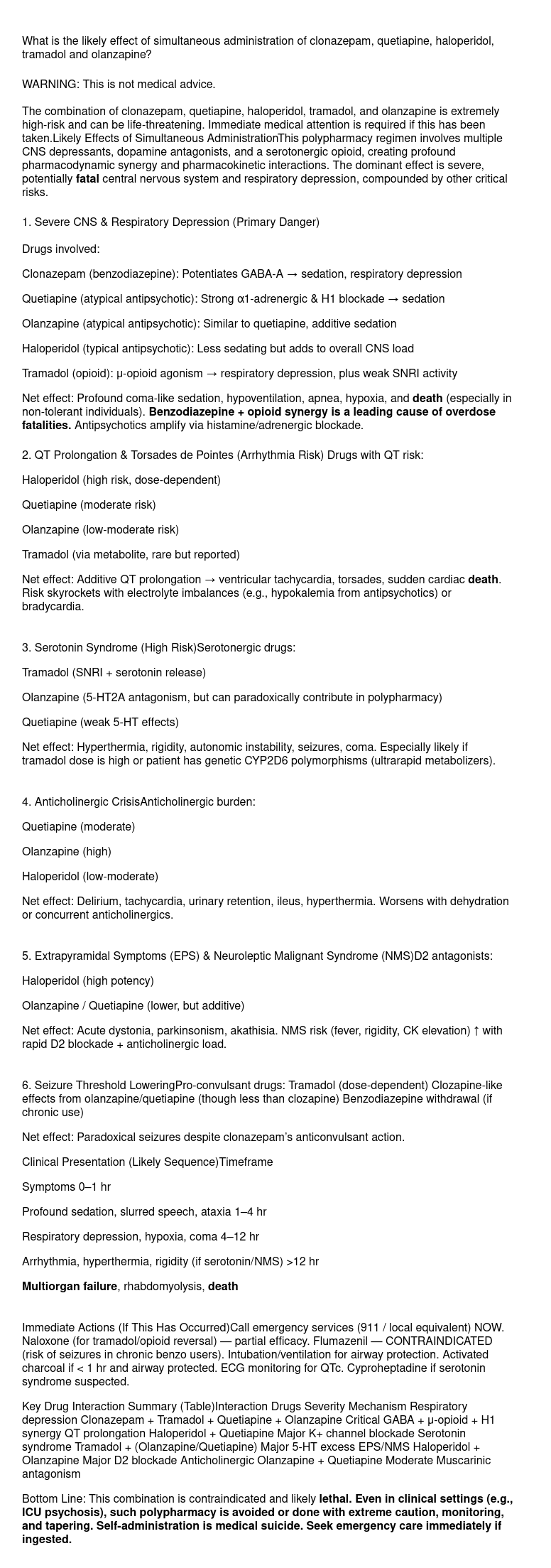 The combination of clonazepam, quetiapine, haloperidol, tramadol, and olanzapine is extremely high-risk and can be life-threatening. Immediate medical attention is required if this has been taken. Likely Effects of Simultaneous AdministrationThis polypharmacy regimen involves multiple CNS depressants, dopamine antagonists, and a serotonergic opioid, creating profound pharmacodynamic synergy and pharmacokinetic interactions. The dominant effect is severe, potentially fatal central nervous system and respiratory depression, compounded by other critical risks. 1. Severe CNS & Respiratory Depression (Primary Danger) Drugs involved: