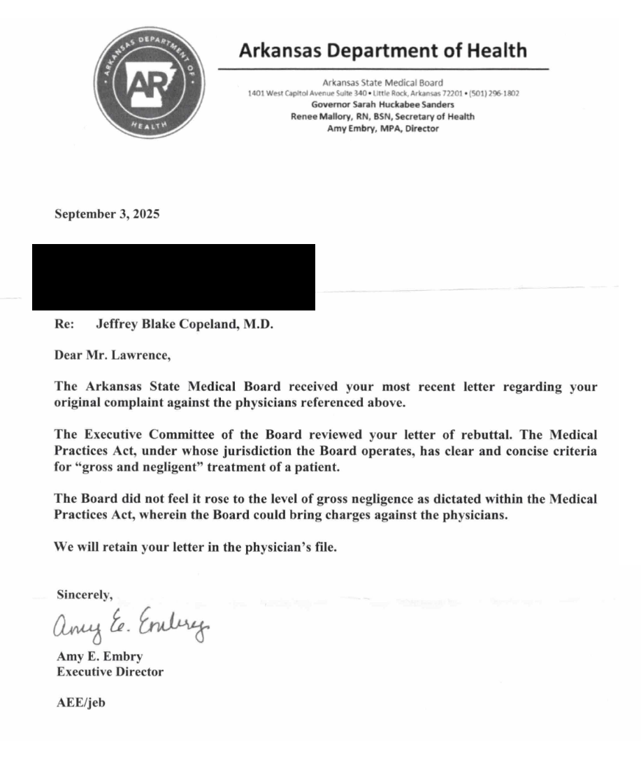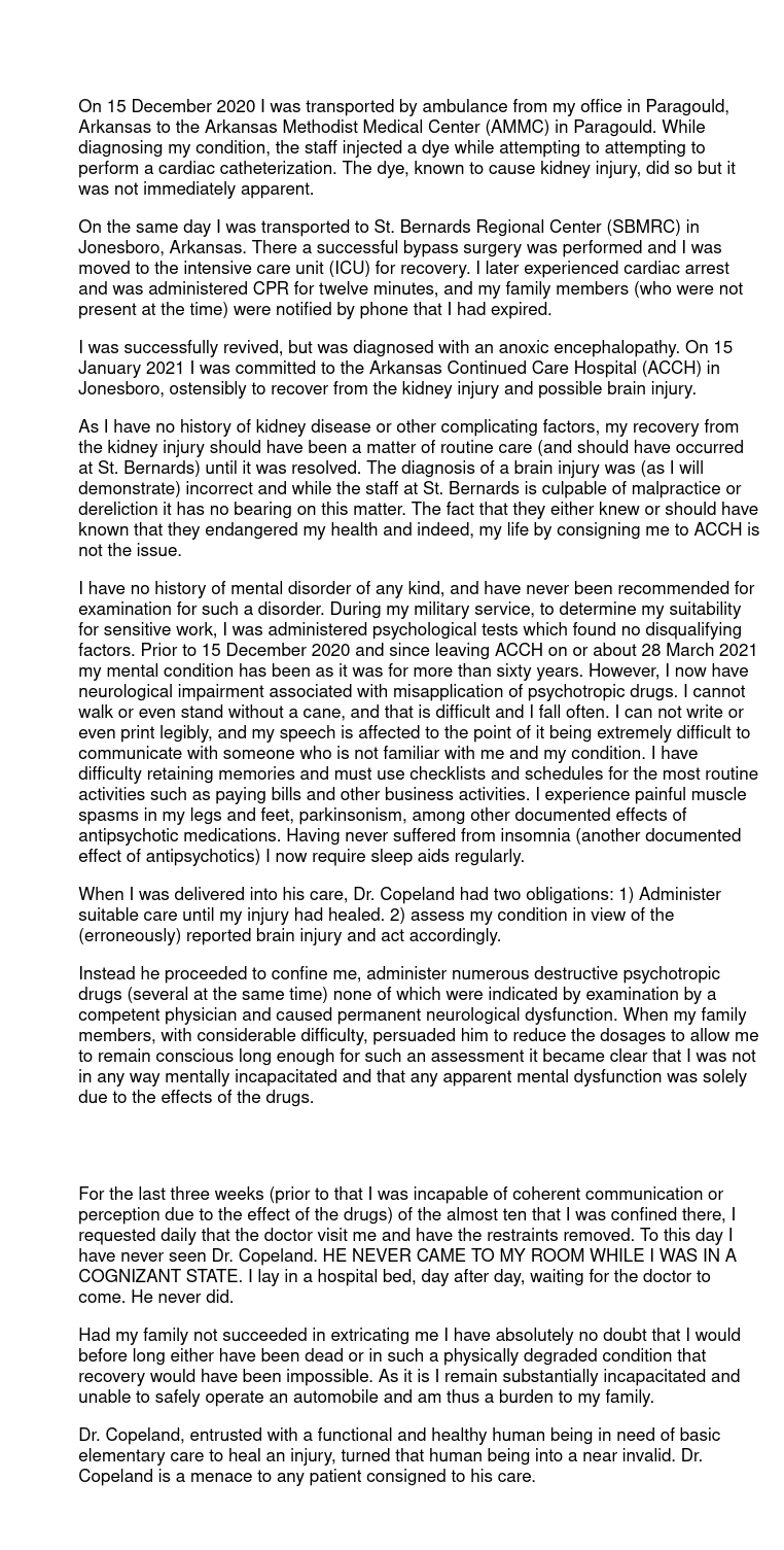 This letter is a formal complaint regarding Jeffery Blake Copeland, a doctor employed from January 2021 through March 2021 and to the best of my knowledge at this time, by Arkansas Continued Care Hospital (ACCH) in Jonesboro, Arkansas.