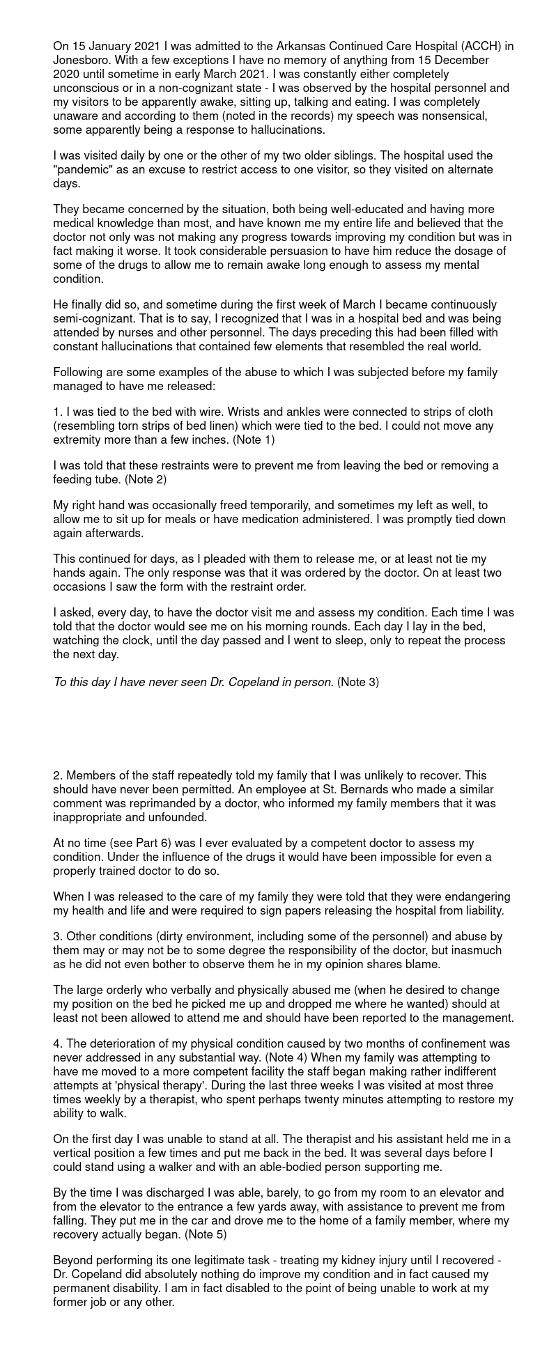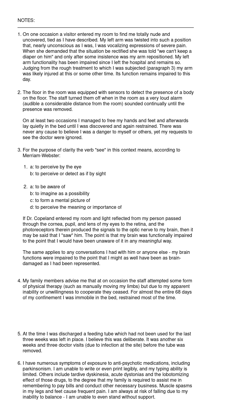visit me and have the restraints removed. To this day I have never seen Dr. Copeland. HE NEVER CAME TO MY ROOM WHILE I WAS IN A COGNIZANT STATE. I lay in a hospital bed, day after day, waiting for the doctor