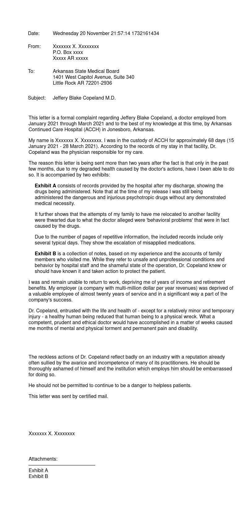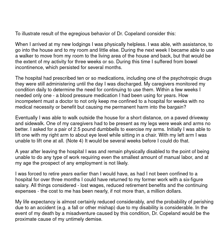 The reason this letter is being sent more than two years after the fact is that only in the past few months, due to my degraded health caused by the doctor's actions, have I been able to do so. It is accompanied by two exhibits: