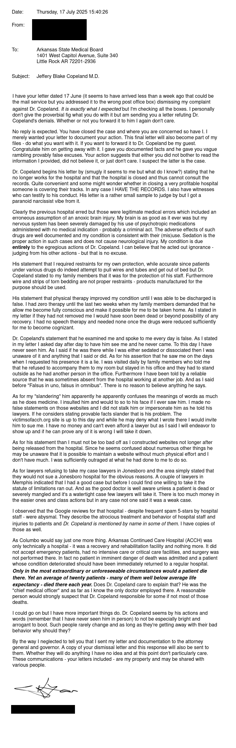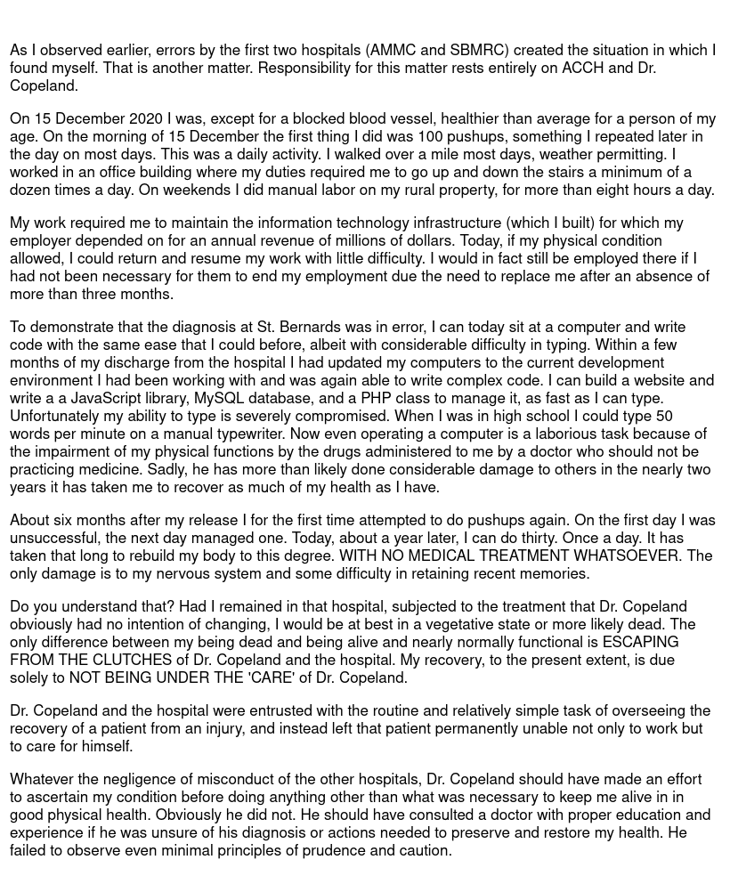 I observed that the Google reviews for that hospital - despite frequent spam 5-stars by hospital staff - were abysmal. They describe the atrocious treatment and behavior of hospital staff and injuries to patients and Dr. Copeland is mentioned by name in some of them. I have copies of those as well.