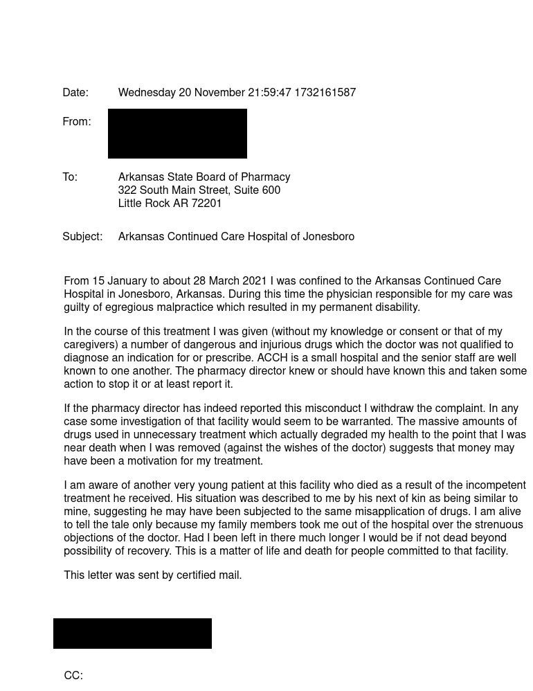 From 15 January to about 28 March 2021 I was confined to the Arkansas Continued Care Hospital in Jonesboro, Arkansas. During this time the physician responsible for my care was guilty of egregious malpractice which